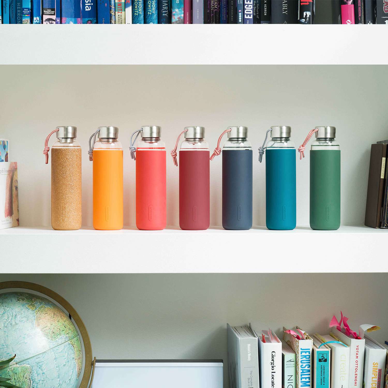 Stylische To-Go Flaschen aus Glas - für pures Trinkvergnügen. Mit Silikonschutzhülle. 600 ml.