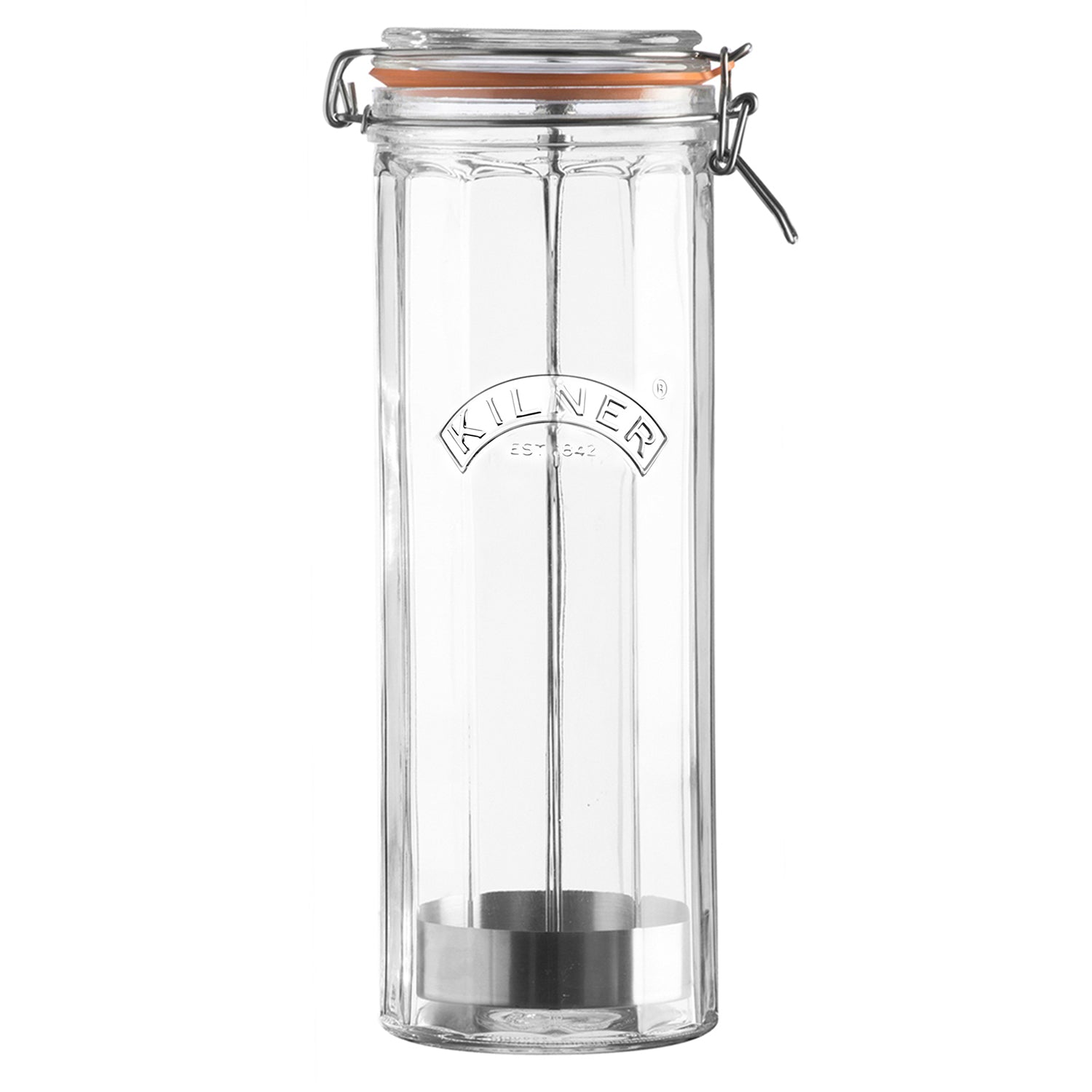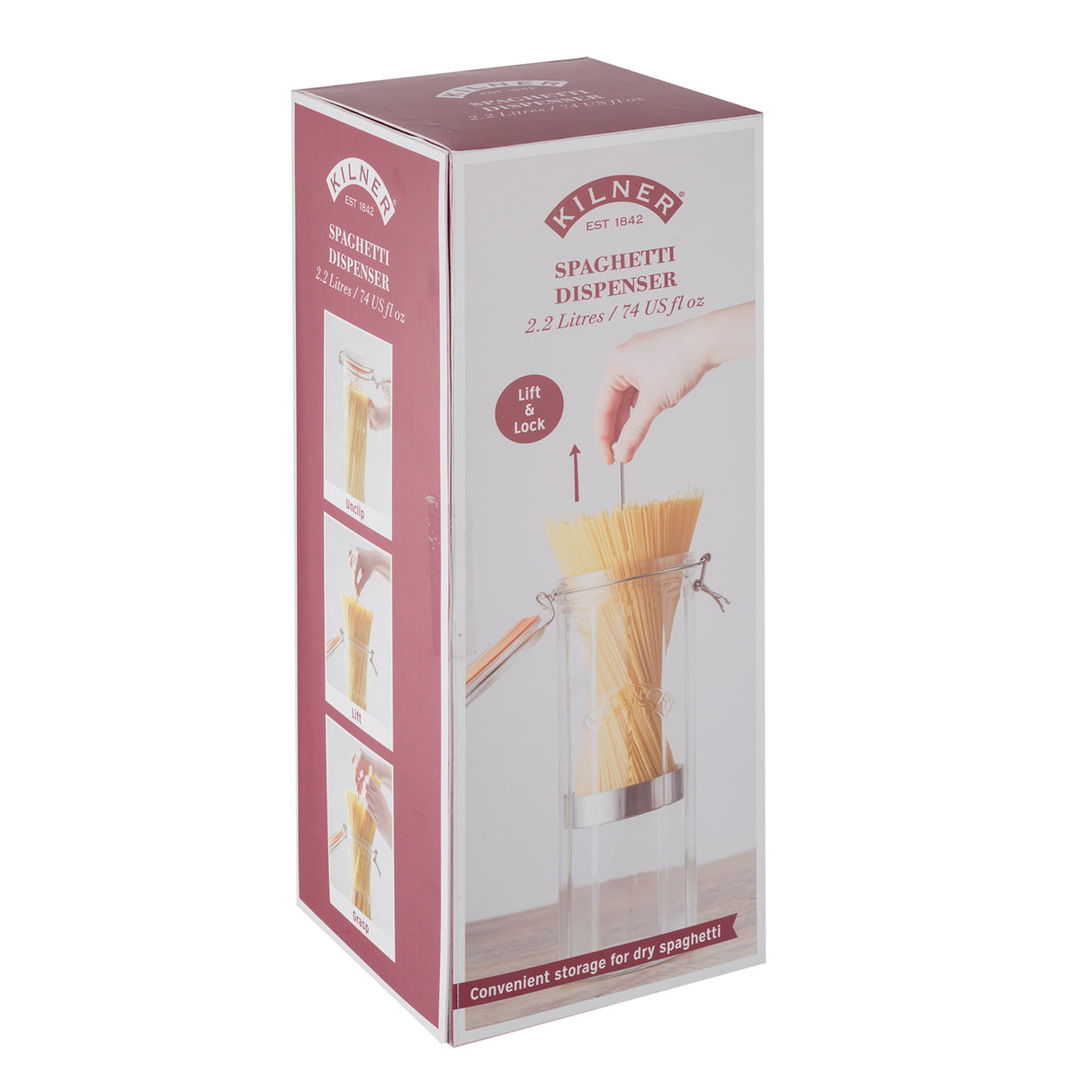 Das facettierte Kilner® Spaghetti Glas Kilner® wurde speziell für die luftdichte Aufbewahrung von Spaghetti entwickelt. Die Besonderheit des Glas ist der innenliegende Halter mit Ständer, wenn der Griff nach oben gezogen wird, fächern sich die Spaghetti auf, so dass die Entnahme besonders einfach und exakt portionierbar ist, ohne ziehen oder schütteln.